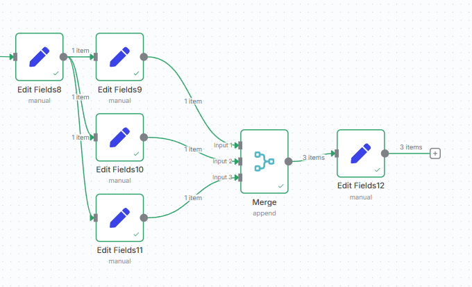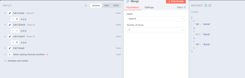 このワークフローのクセがあるため、「電池の並列つなぎ」を実現するには、「処理を一時的に止めて、入力が一定数になると先に進む」という挙動をするノード(Mergeノードなど)やロジックが必要になります。