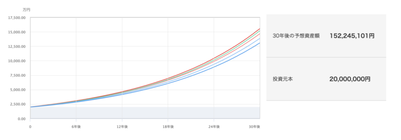 以下は、初期投資2000万円で、積立投資をせず30年、年率7%で運用した場合の結果です。